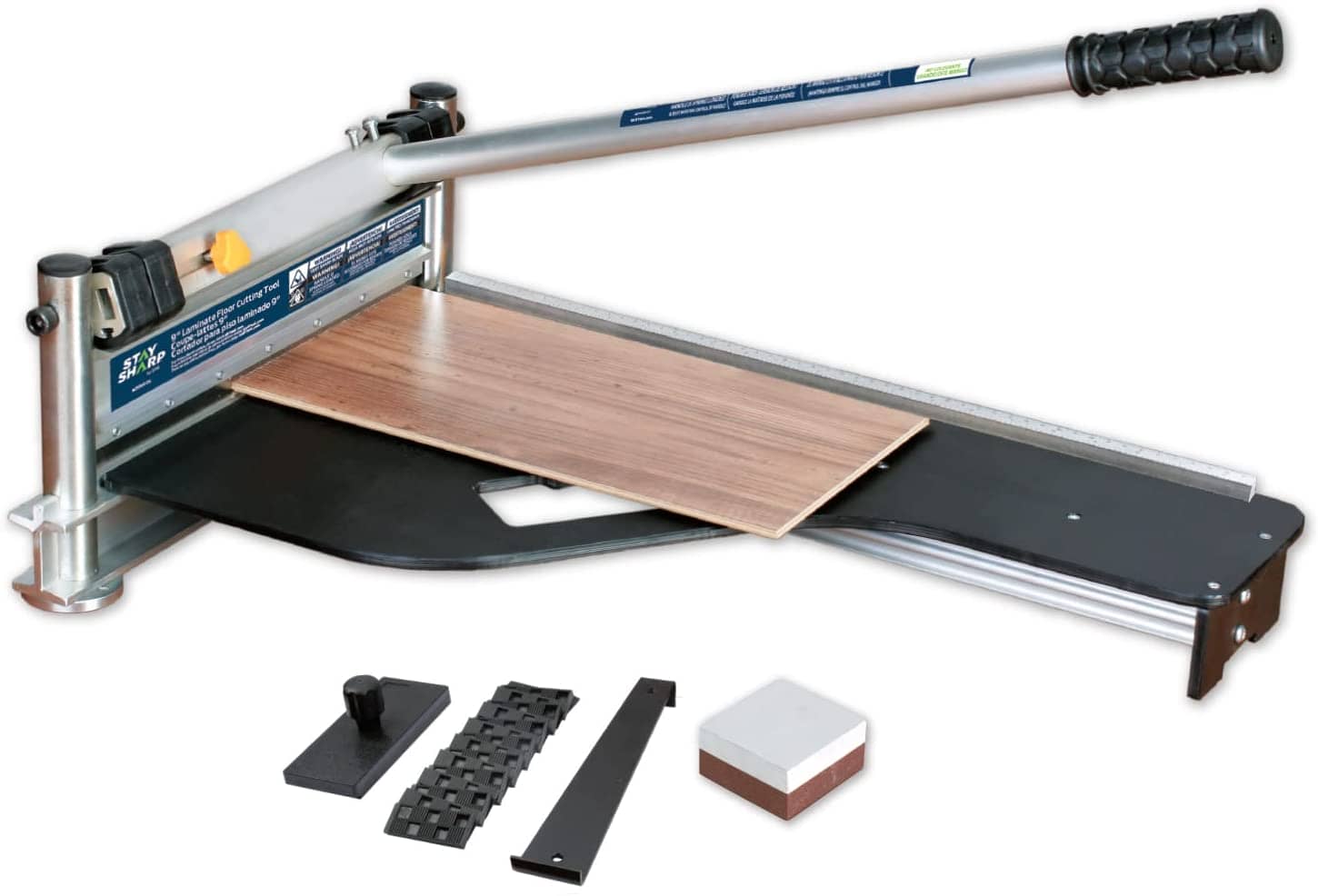 The Roberts 10-94 high-end cutter can cut to 13 inches of laminate flooring. It is also ideal to use to cut through various other materials like vinyl, rubber, and engineered wood. The blade is made with tungsten and thus is very tough. In case of any damage, you can get a replacement blade quickly. The frame is made of strong aluminum but light in weight. The cutter features a long handle that gives it extra leverage. A guide locks securely in its place and lets you make a clean 45-degree cut.