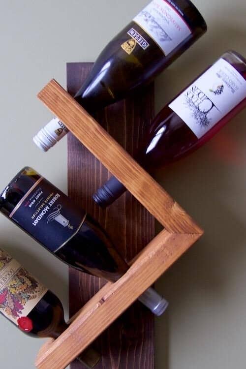 The Kreg jig ensures a clean connection between the boards and prevents the bottle from scratching against screw heads. The angle for the diagonal layers should be slanted enough to display the bottle but not too much slant so that the wine is no longer touching the cork. Dark walnut stains never disappoint when you want to create a warm design that can fit into brightly colored backgrounds.